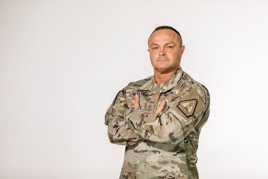 Soldiers are expected to maintain a neat and professional appearance at all times. This includes ensuring the uniform is clean, pressed, and free of excessive wear and tear. The OCP uniform is designed to be worn with appropriate undergarments, and modifications should only be made by authorized personnel. Consistent and correct wear reflects discipline and pride within the ranks, upholding the Army’s standards of professionalism and readiness. Attention to detail in uniform wear demonstrates respect for the uniform and the Army itself.